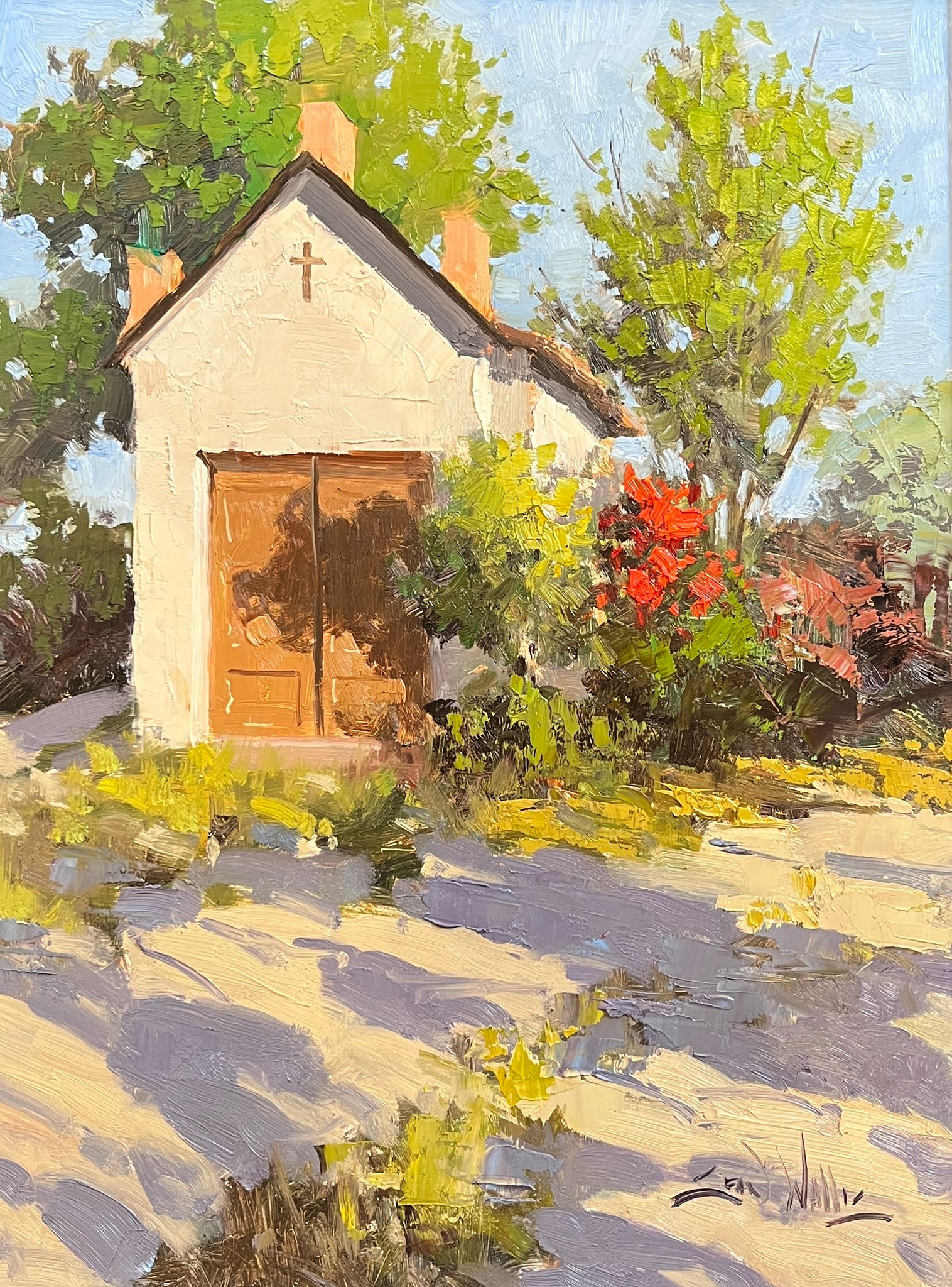 With his palette already loaded in a box he built himself, Sean can go from his car to painting in about 5 minutes. “The goal is to get brush to canvas as soon as possible to capture what it is that inspired me in the first place. When the light changes, everything changes. As an impressionist painter, it is all about the relationship of light and color. I want to show how the light interacts with the subject matter, and I have to do it on the clock—on a timer. I will get a painting 60% finished and have to pack it up. The last thing you want to do is chase the light,” reflects Wallis. “I do paint large (up to 24 x 30-inch canvases) while I’m out there which enables my plein air paintings to be gallery ready, rather than blowing them up back in the studio. I paint because I enjoy it; I paint how I enjoy it. Big brush and a big canvas, and I’m happy.”